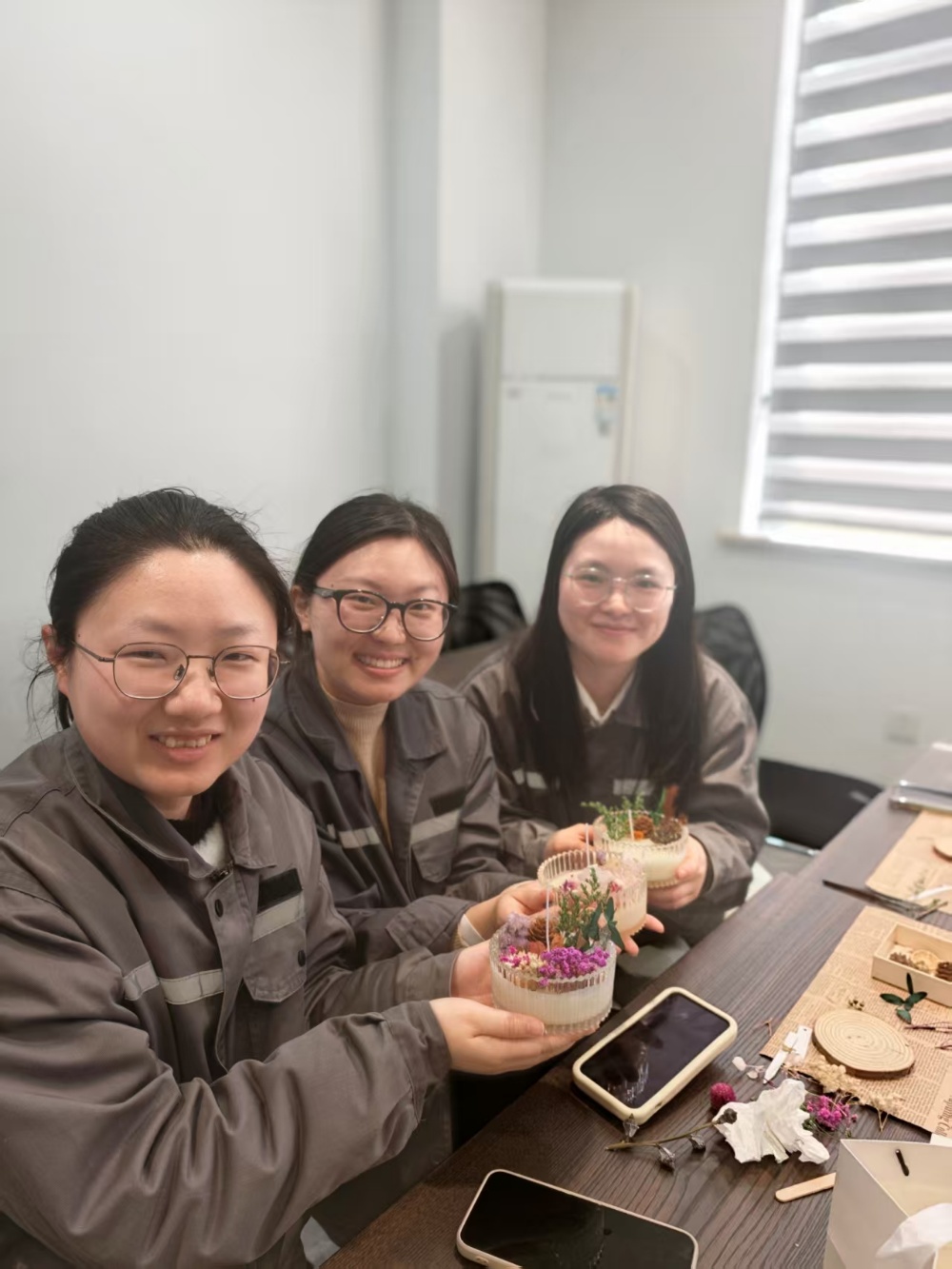 從挑選干花、構思造型,到融化豆蠟、調制香氛,再到冷卻凝固、裝飾點綴……大家全神貫注地投入到香薰蠟燭的制作過程中。原本零散的原材料,在一雙雙巧手下,逐漸變成了一份份獨具匠心、精致美觀的香薰作品。